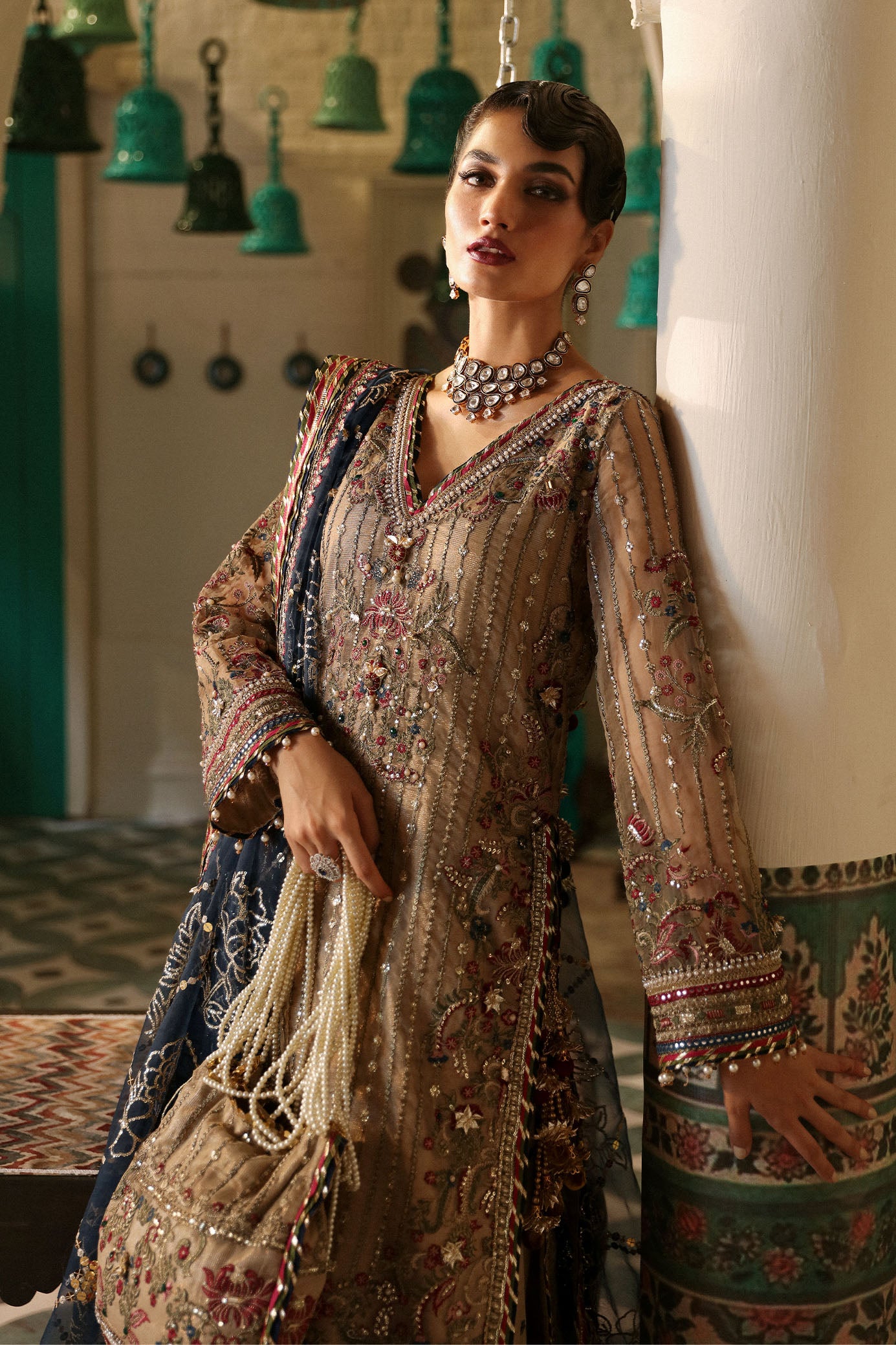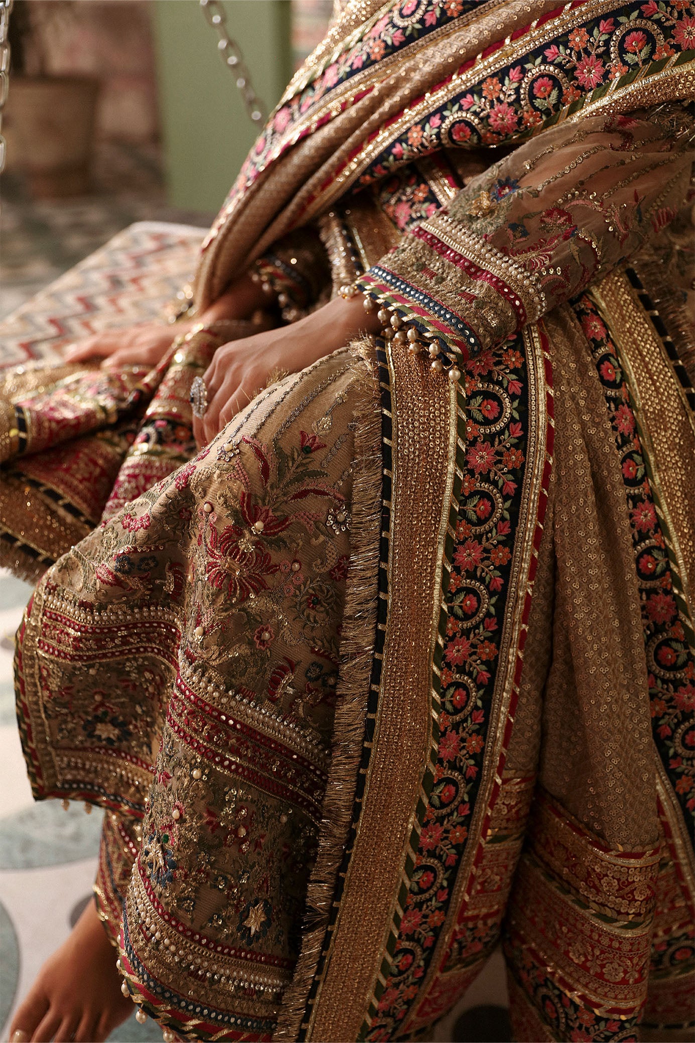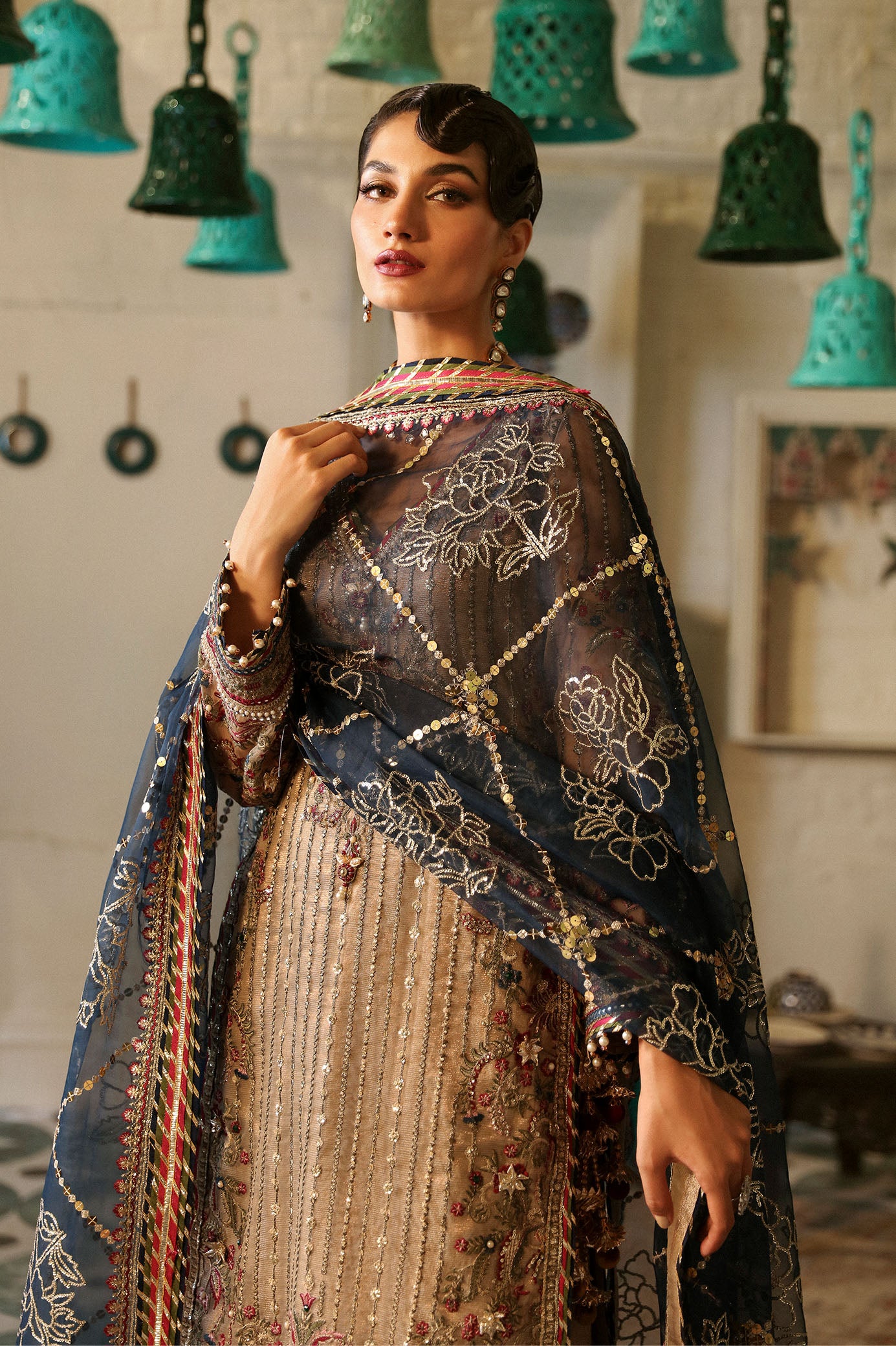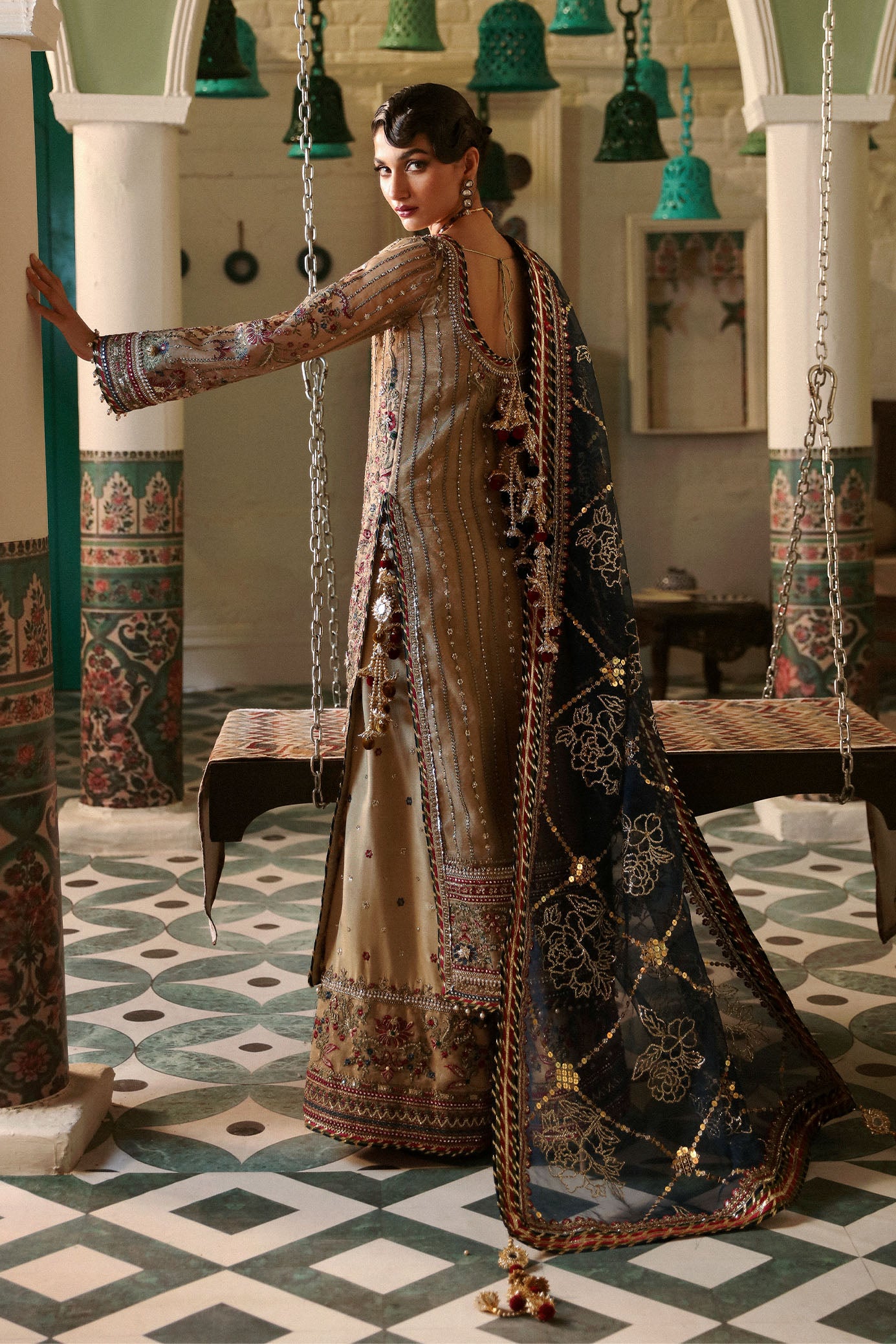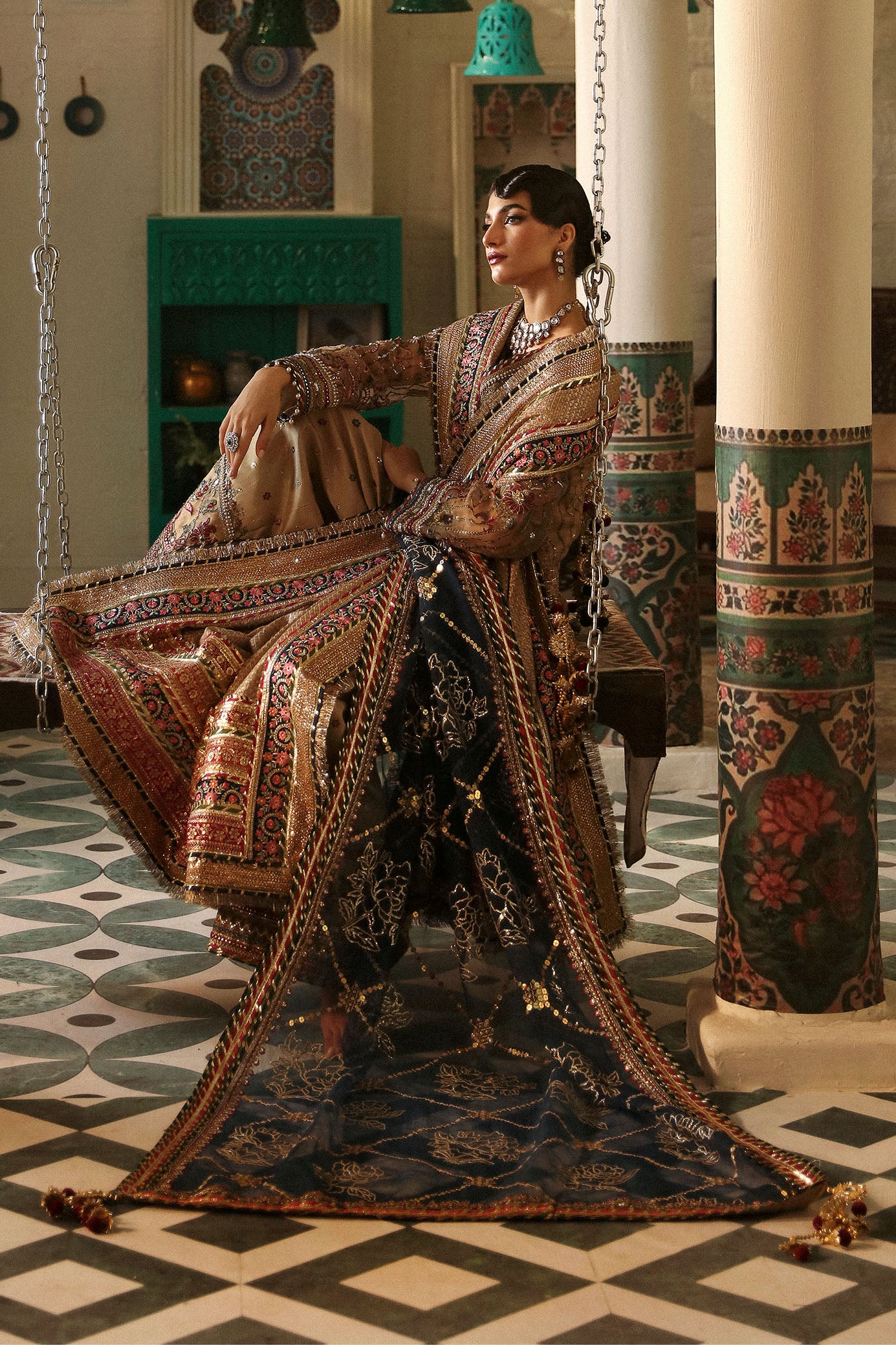 A gold organza base serves as a canvas to meticulously designed embroidery in gold, silver, blue and maroon. This long shirt has a detailed neckline and is paired up with an heavenly embroidered sharara.The navy dupatta finished with a heavenly gorgeous border and tassels is the star of the show.