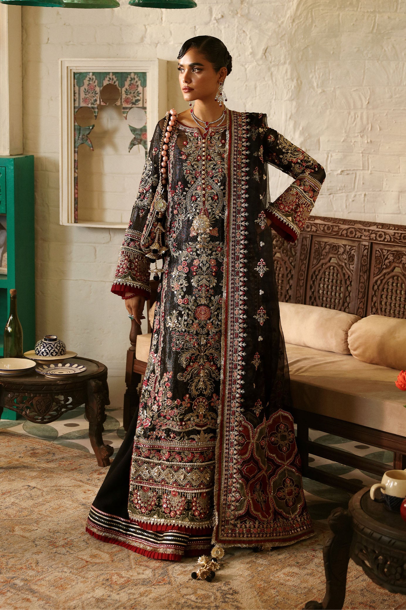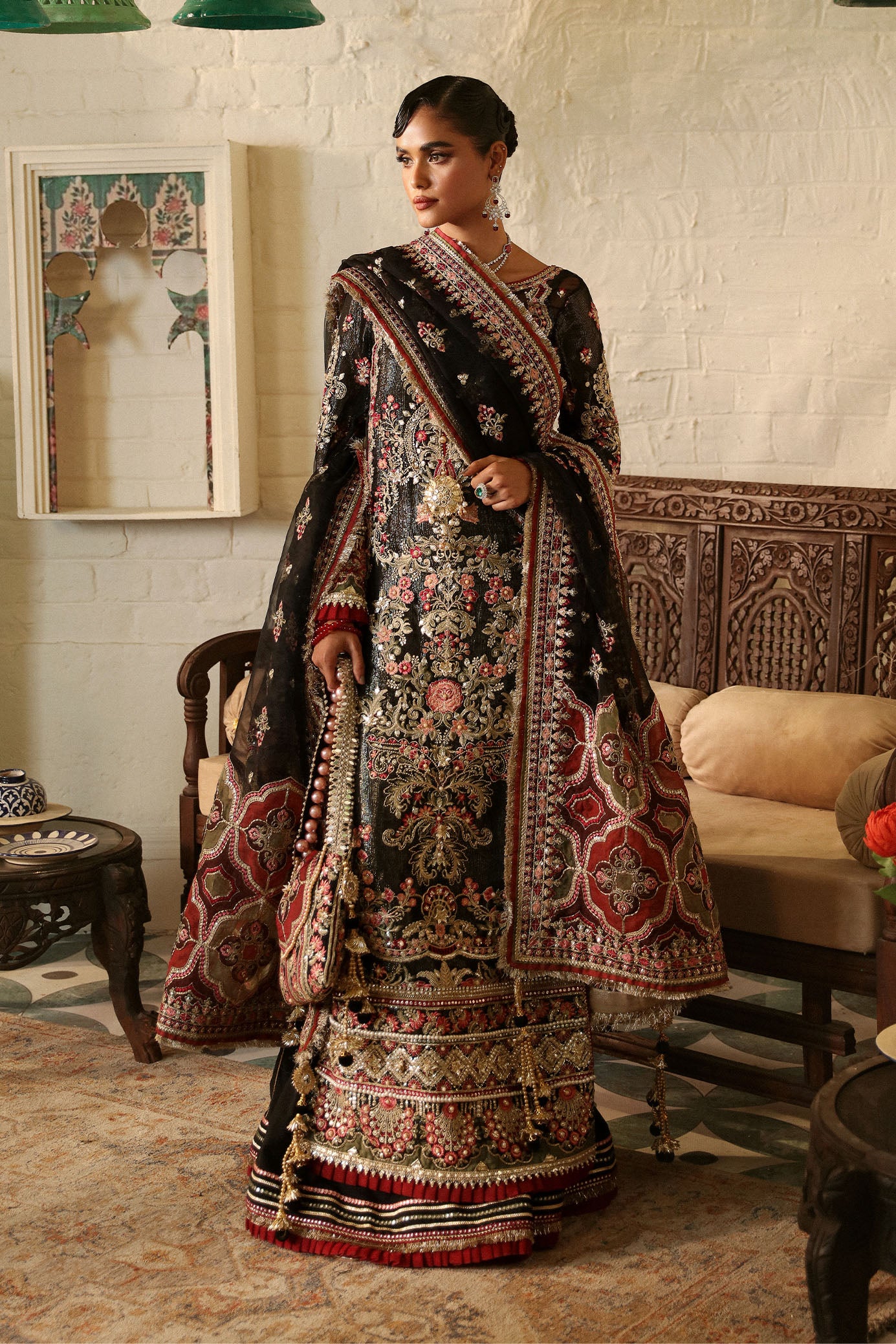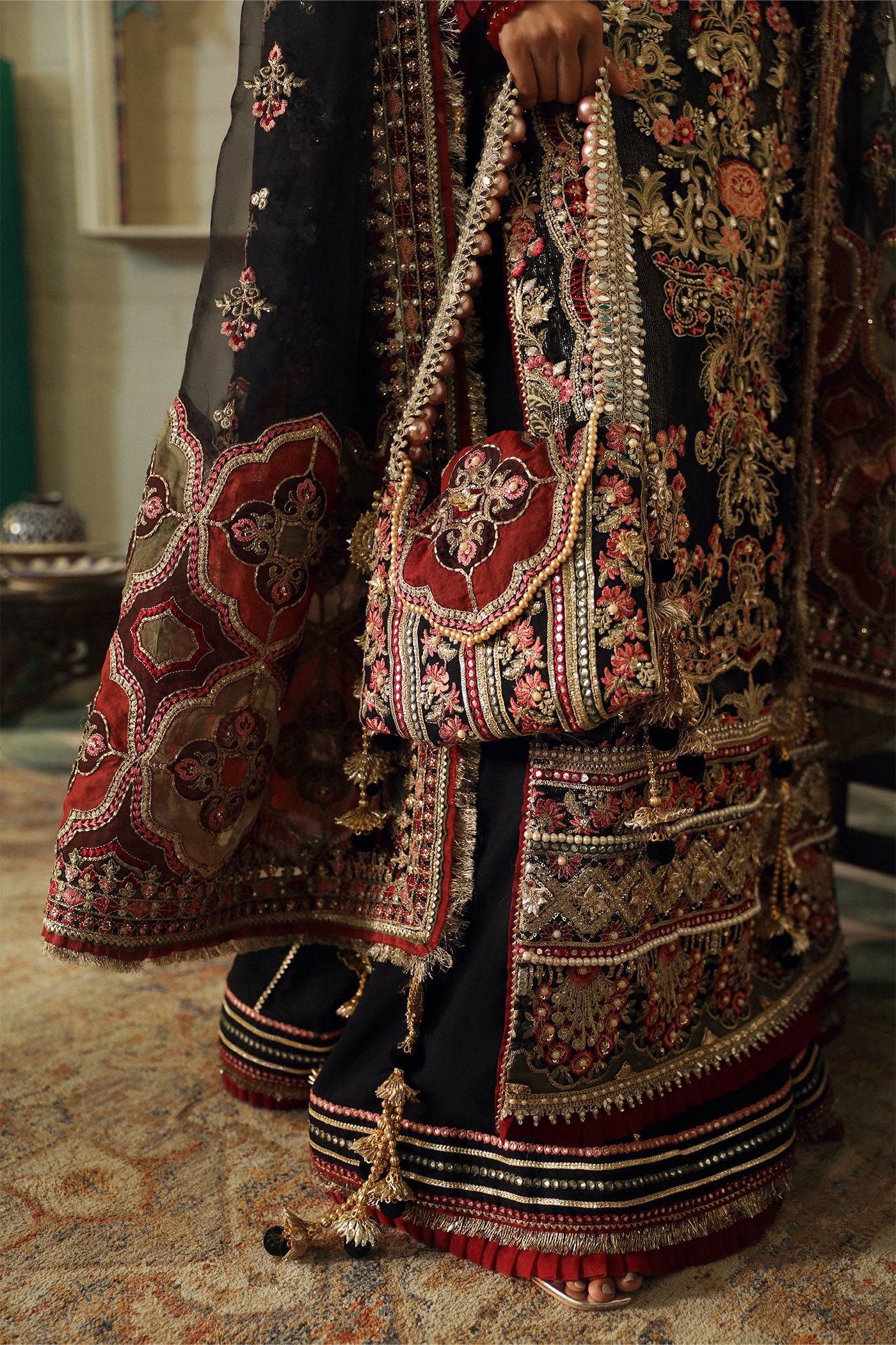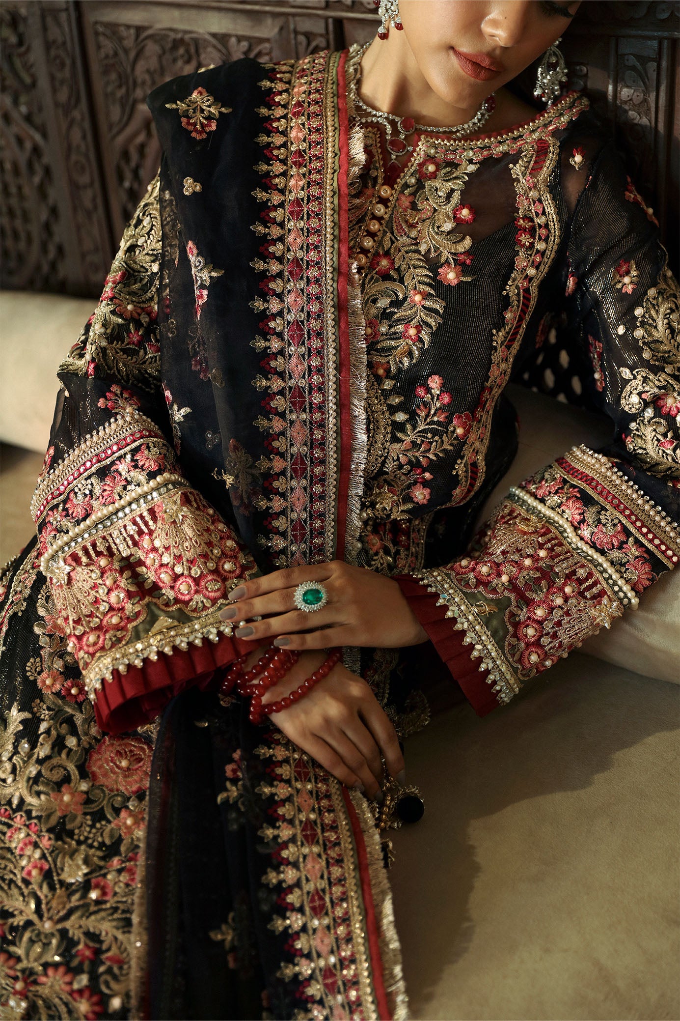 A black organza base serves as a canvas to meticulously designed embroidery in gold, silver, green and maroon. This long shirt is paired up with an embroidered sharara and dupatta finished with a heavenly gorgeous border.