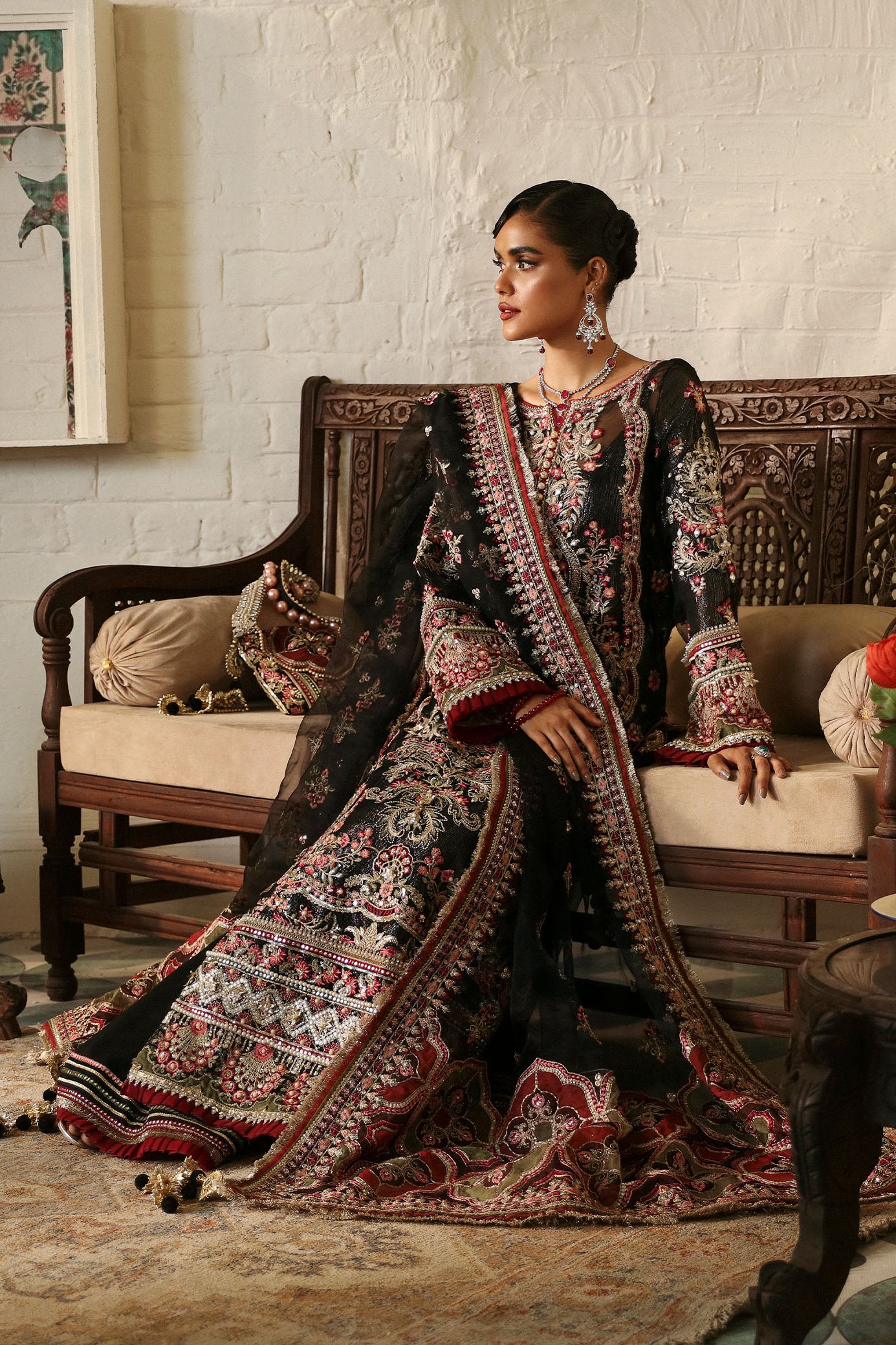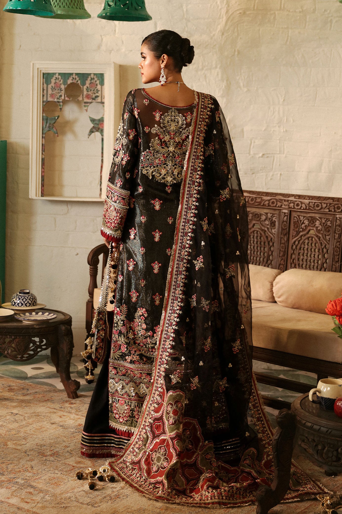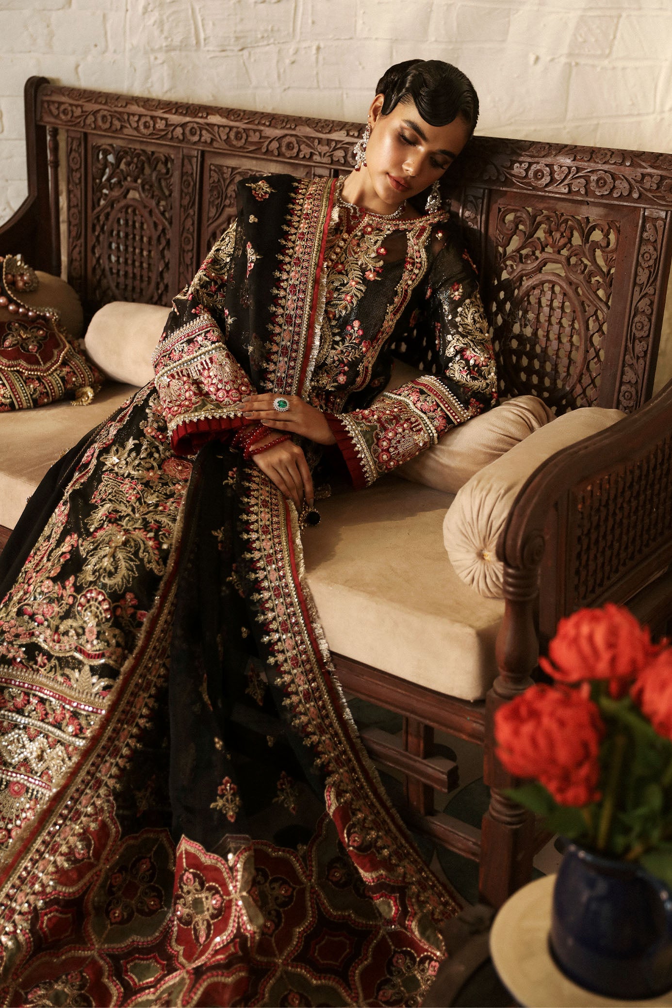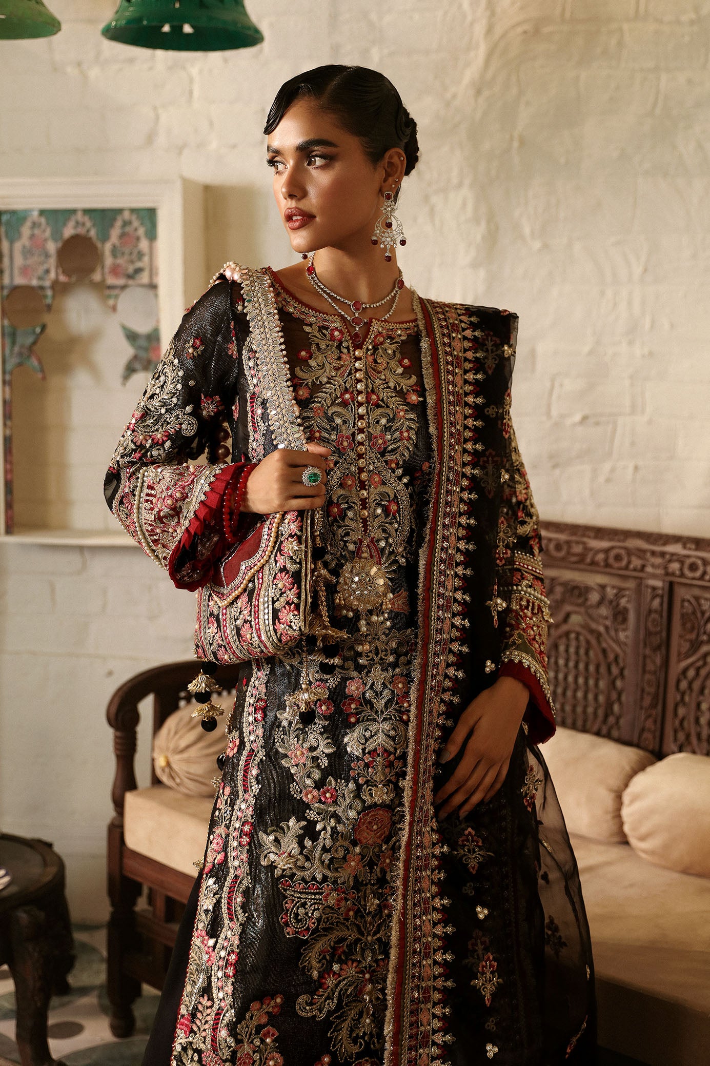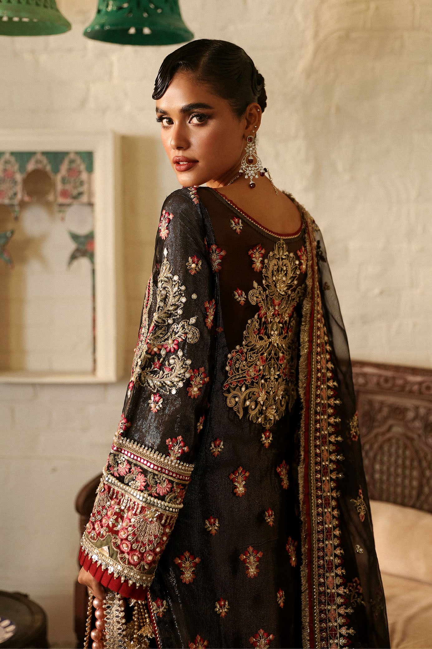 A black organza base serves as a canvas to meticulously designed embroidery in gold, silver, green and maroon. This long shirt is paired up with an embroidered sharara and dupatta finished with a heavenly gorgeous border.